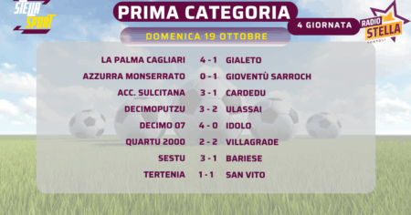 Bariese male in quel di Sestu, l’ogliastrina termina con una sconfitta di 2 reti a 1. Idolo malissimo, anche lei in trasferta contro il Decimo 07, rientra a casa con una sconfitta netta di 4 a 0. Finisce in parità tra Quartu 2000 e Villagrande, seguita per noi in trasferta da Marcello Peddiu. 1 a 1 il finale.