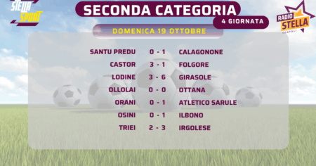 In seconda categoria, nell’anticipo di sabato bene la Castor che chiude 3 a 1 il suo match disputato al “Fra Locci” contro la Folgore Polisportiva. La doppietta di Murreli e il goal di Guaia hanno siglato la vittoria dei granata.